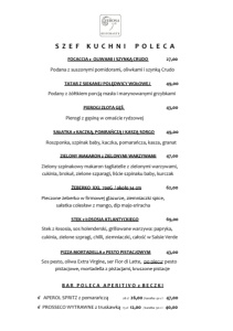 S Z E F K U C H N I P O L E C A FOCACCIA z OLIWAMI i SZYNKĄ CRUDO 27,00 Podana z suszonymi pomidorami, oliwkami i szynką Crudo TATAR Z SIEKANEJ POLĘDWICY WOŁOWEJ 49,00 Podany z żółtkiem porcją masła i marynowanymi grzybkami PIEROGI ZŁOTA GĘŚ 43,00 Pierogi z gęsiną w omaście rydzowej SAŁATKA z KACZKĄ, POMRAŃCZĄ i KASZĄ SORGO 49,00 Roszponka, szpinak baby, kaczka, pomarańcza, kasza, granat ZIELONY MAKARON z ZIELONYMI WARZYWAMI 47,00 Zielony szpinakowy makaron tagliatelle z zielonymi warzywami, cukinia, brokuł, zielone szparagi, liście szpinaku baby, kurczak ŻEBERKO XXL 700G / około 34 cm 62,00 Pieczone żeberko w firmowej glazurze, ziemniaczki spice, sałatka colesław z mango, dip majo-sriracha STEK z ŁOSOSIA ATLANTYCKIEGO 69,00 Stek z łososia, sos holenderski, grillowane warzywa: papryka, cukinia, zielone szpragi, chilli, ziemniaczki, całość w Salsie Verde PIZZA MORTADELLA z PESTO PISTACJOWYM 43,00 Sos pesto, oliwa Extra Virgine, ser Fior di Latte, po piecu: pesto pistacjowe, mortadella z pistacjami, kruszone pistacje B A R P O L E C A A P E R I T I V O z B E C Z K I √ APEROL SPRITZ z pomarańczą 28 cl 26,00 / karafka 50 c l 47,00 √ PROSSECO WYTRAWNE z truskawką 15 cl 12,00 / karafka 50 c l 40,00
